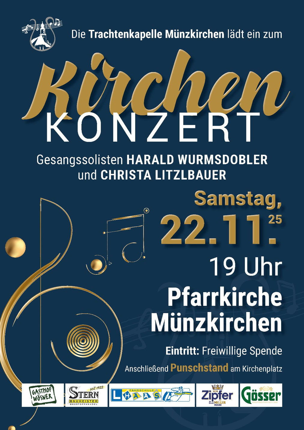 Wir laden euch zu unserem Kirchenkonzert am Samstag 22. November 2025 um 19:00 mit den Gastsolisten Christa Litzlbauer und Harald Wurmsdobler in der Pfarrkirche Münzkirchen sehr herzlich ein.